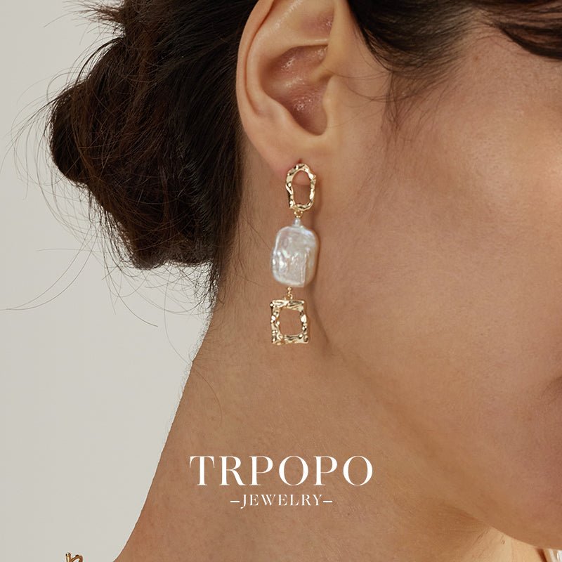 earrings showcase an exquisite design with irregular square gold - toned elements. They dangle gracefully, featuring large, lustrous baroque pearls in the center, creating a harmonious blend of classic and contemporary aesthetics.