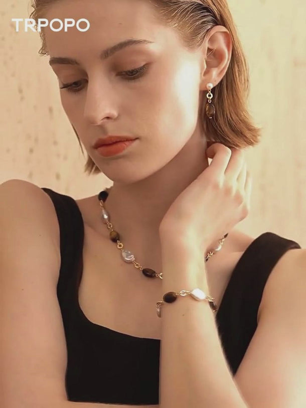 Baroque Pearl & Tiger's Eye Gold Chain Necklace