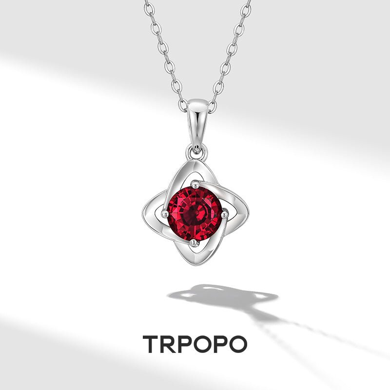 A blazing ruby embraced by interwoven silver halo, radiating atomic energy โ€“ fire spins at your neck, pure untamed power.