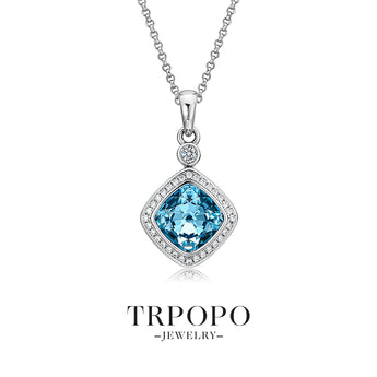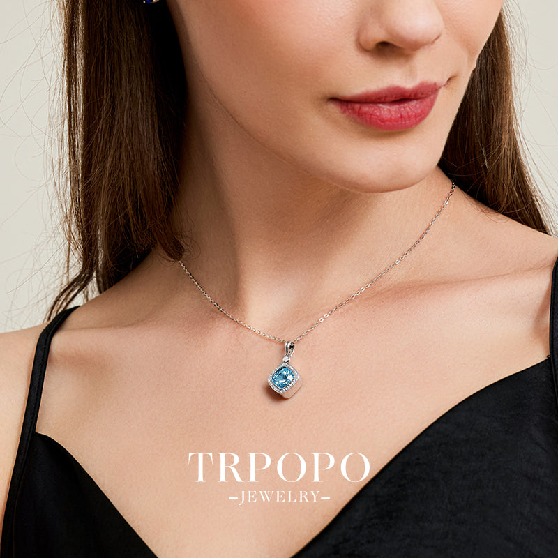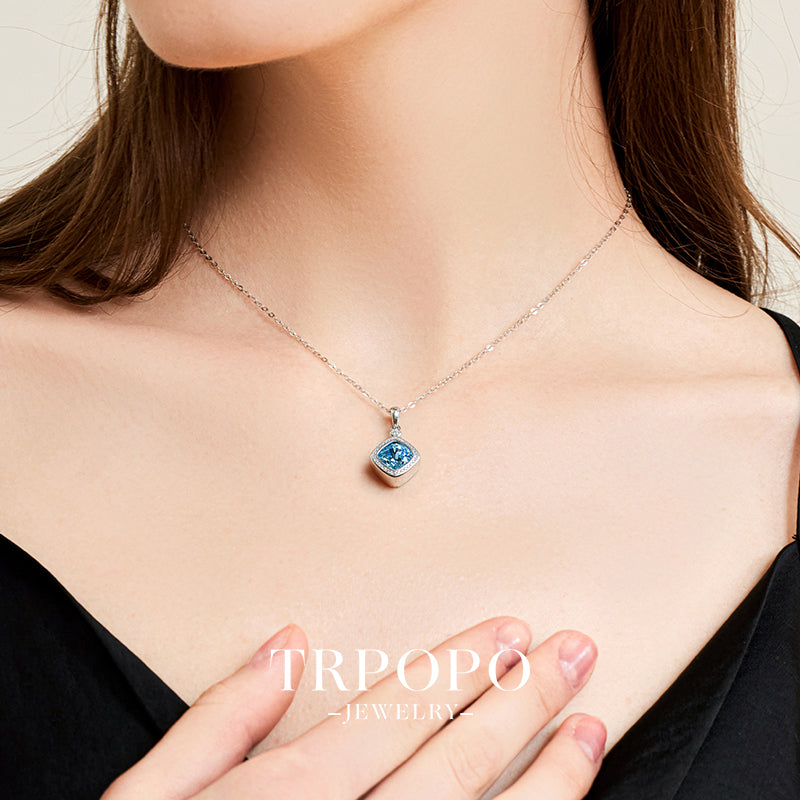 A square-cut lake blue gem takes center stage, encircled by a sparkling diamond halo, with a tiny accent diamond above. Paired with a delicate chain, it captures the serene allure of lake waters in an elegantly glittering design.