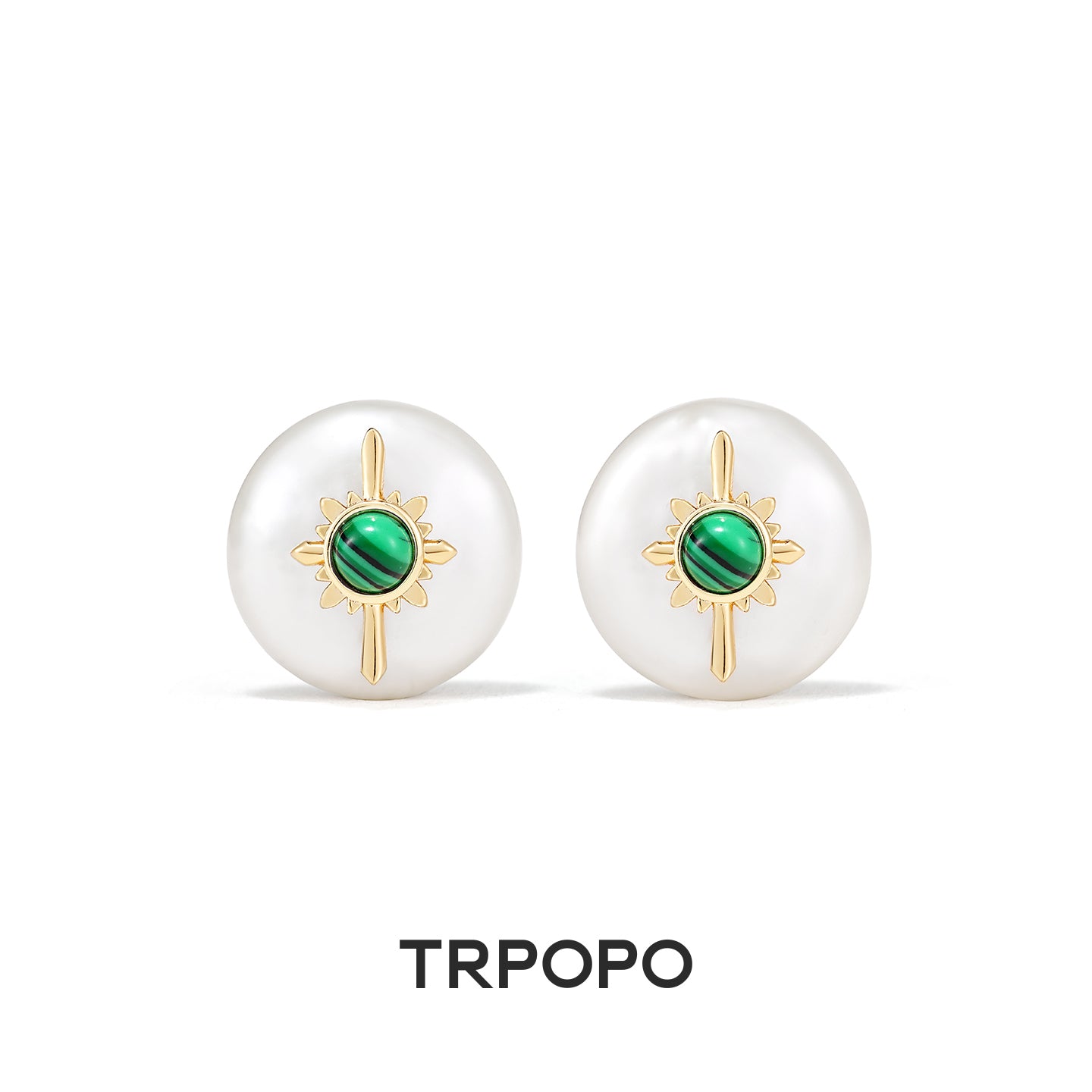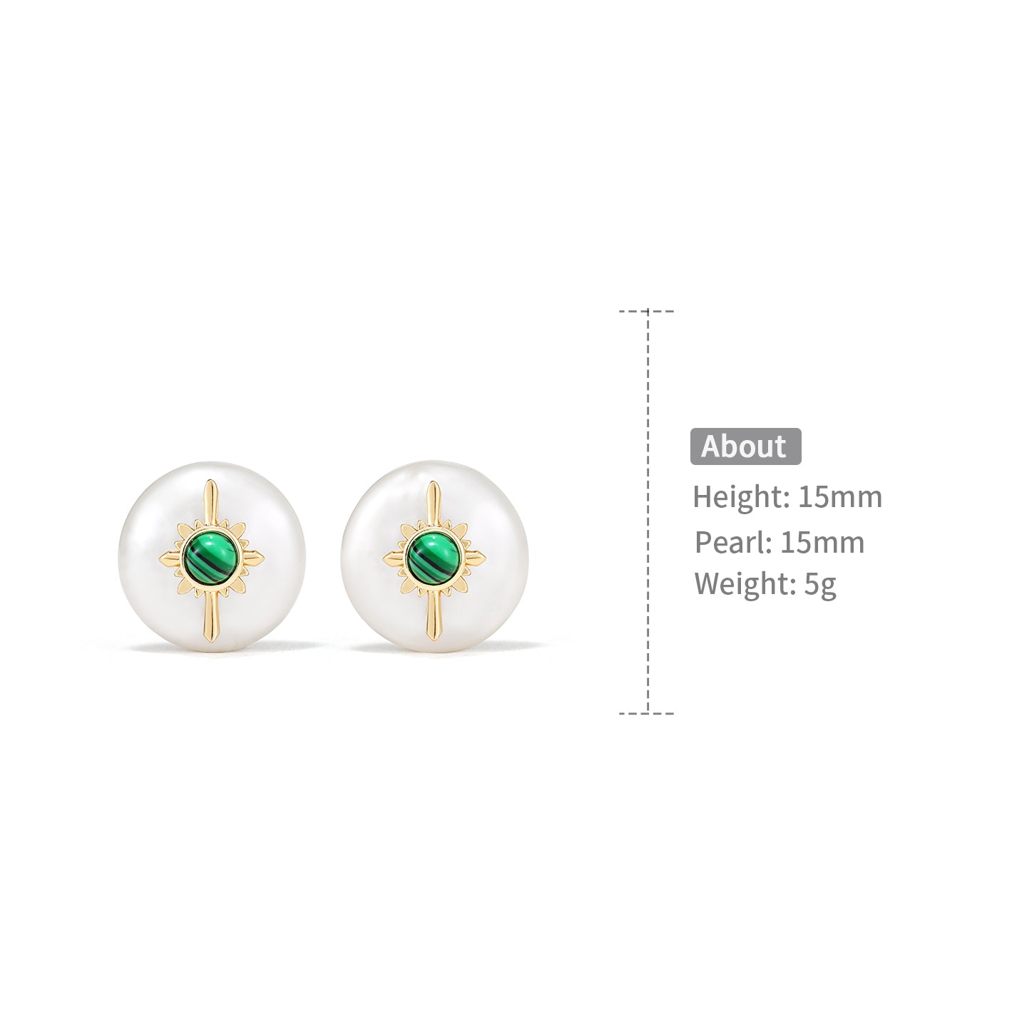 These stud earrings feature a full round pearl base, centered with a deep green Malachite cabochon, framed by a gold-toned sunburst pattern. The design blends vintage and exotic elements. The natural veins of the Malachite contrast beautifully with the pearl's soft luster, creating an elegant yet powerful look.