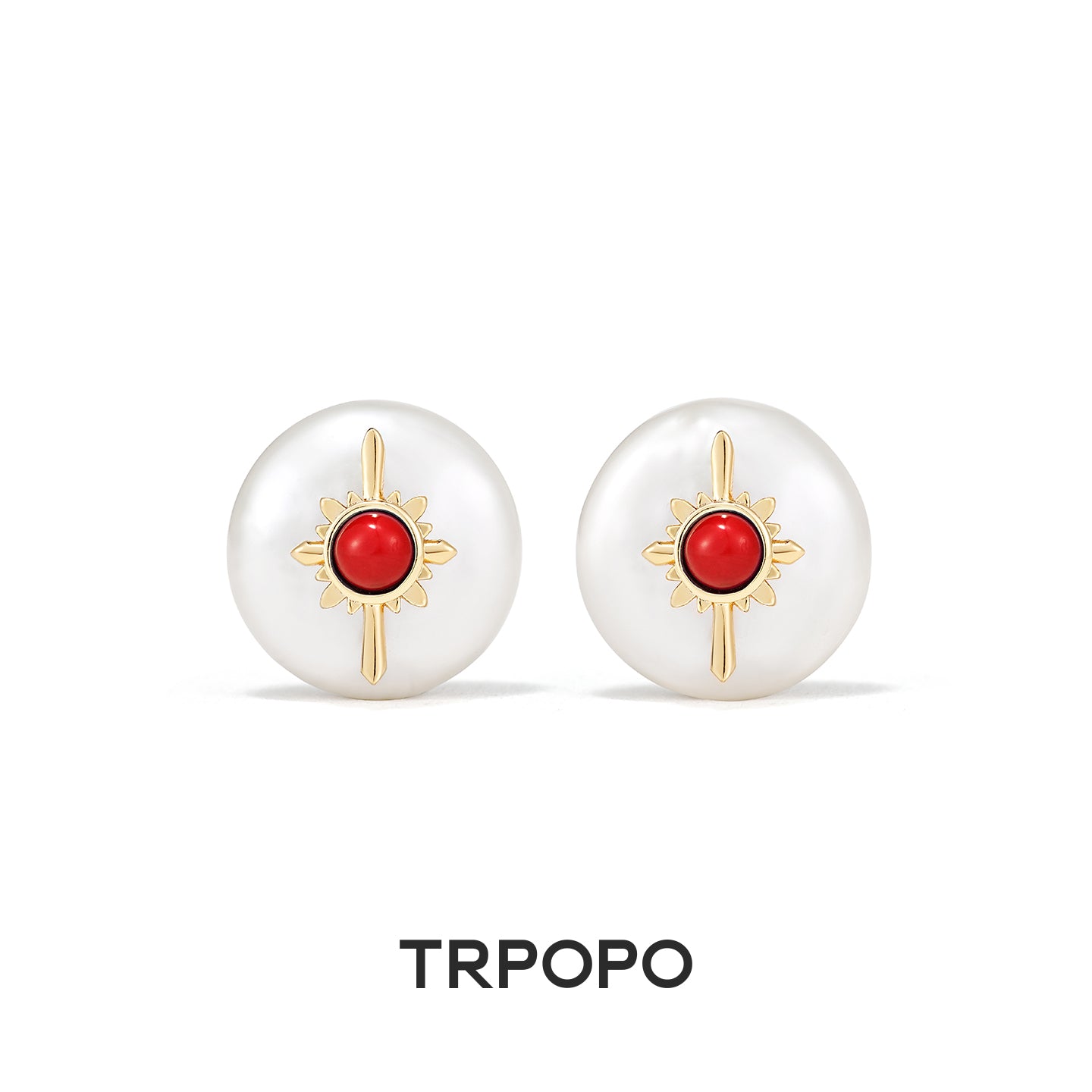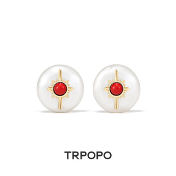 These stud earrings use a lustrous round pearl as the base, centered with a vibrant red cabochon (such as coral or carnelian), surrounded by a detailed gold-toned sunburst pattern. The pairing of red, white pearl, and gold exudes passion and vitality. The design is both classic and eye-catching, bringing a bold touch of vintage brilliance to your look.