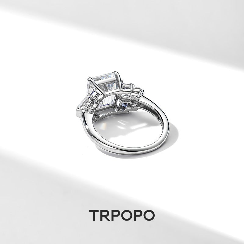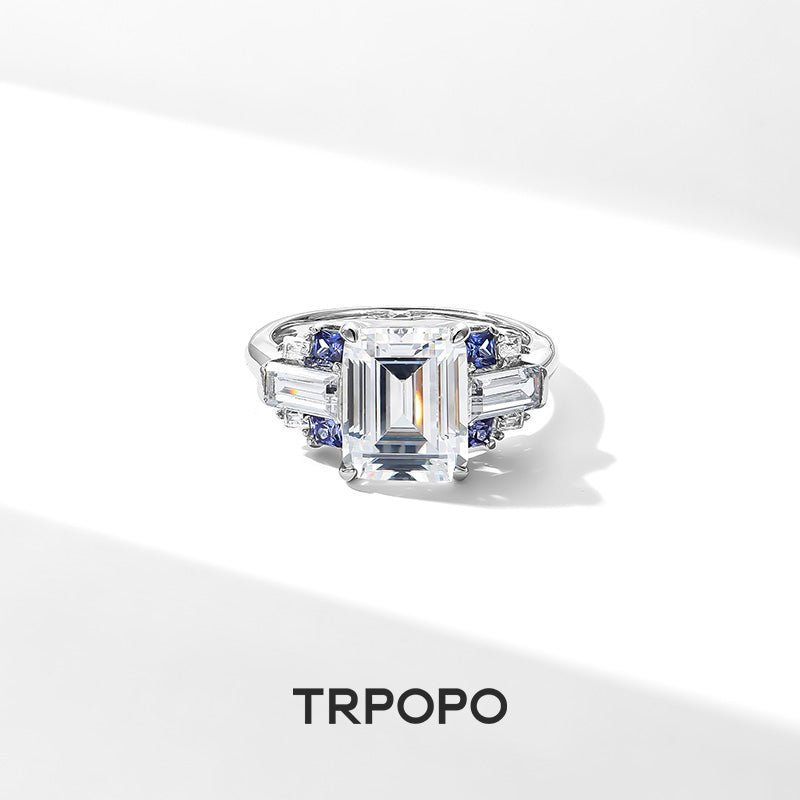 Diamond-cut center diamond guarded by sapphire trapezoids, framed in layered brilliance – icy blue meets cold white, untamed power and mystery on your finger.