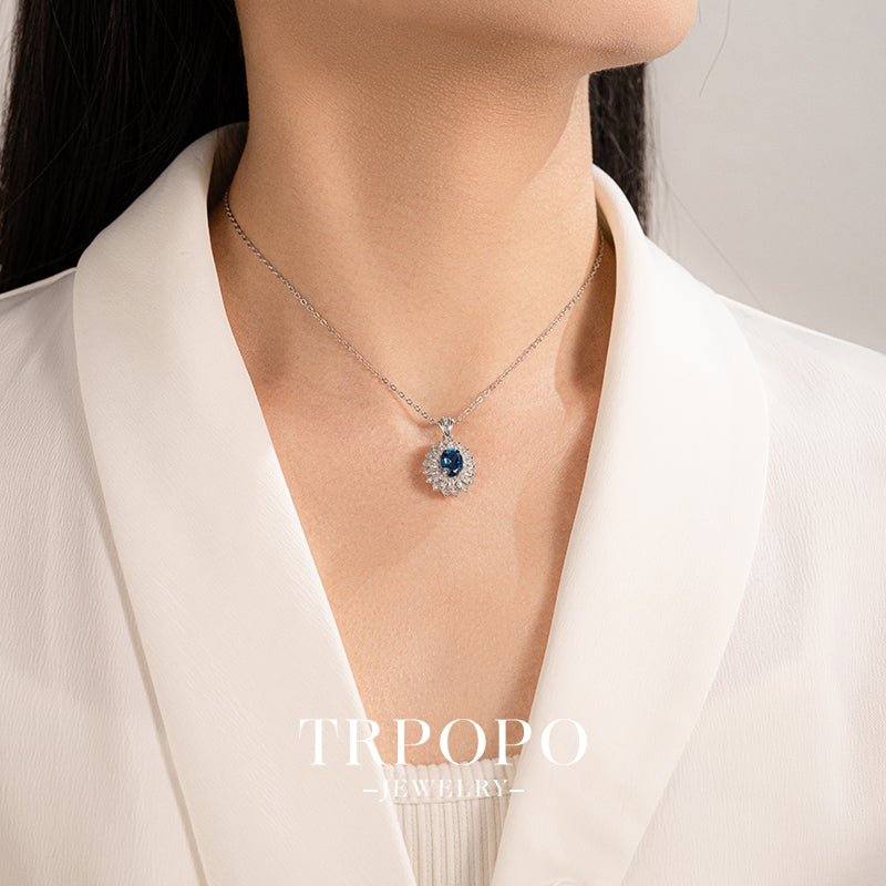Profound London blue topaz encircled by diamond petals, blooming across necklace, earrings, and ring – the coldest heart of the ocean, proud and dazzling, igniting every inch of you.