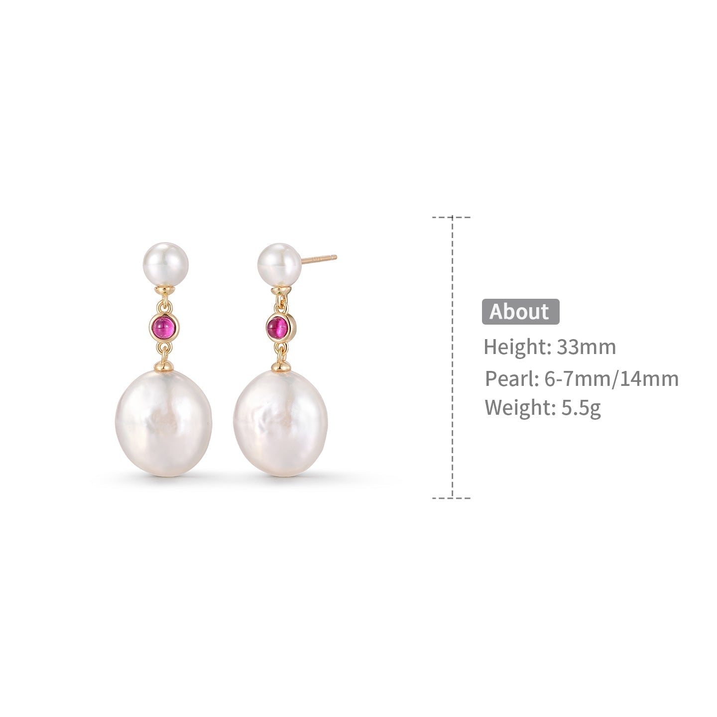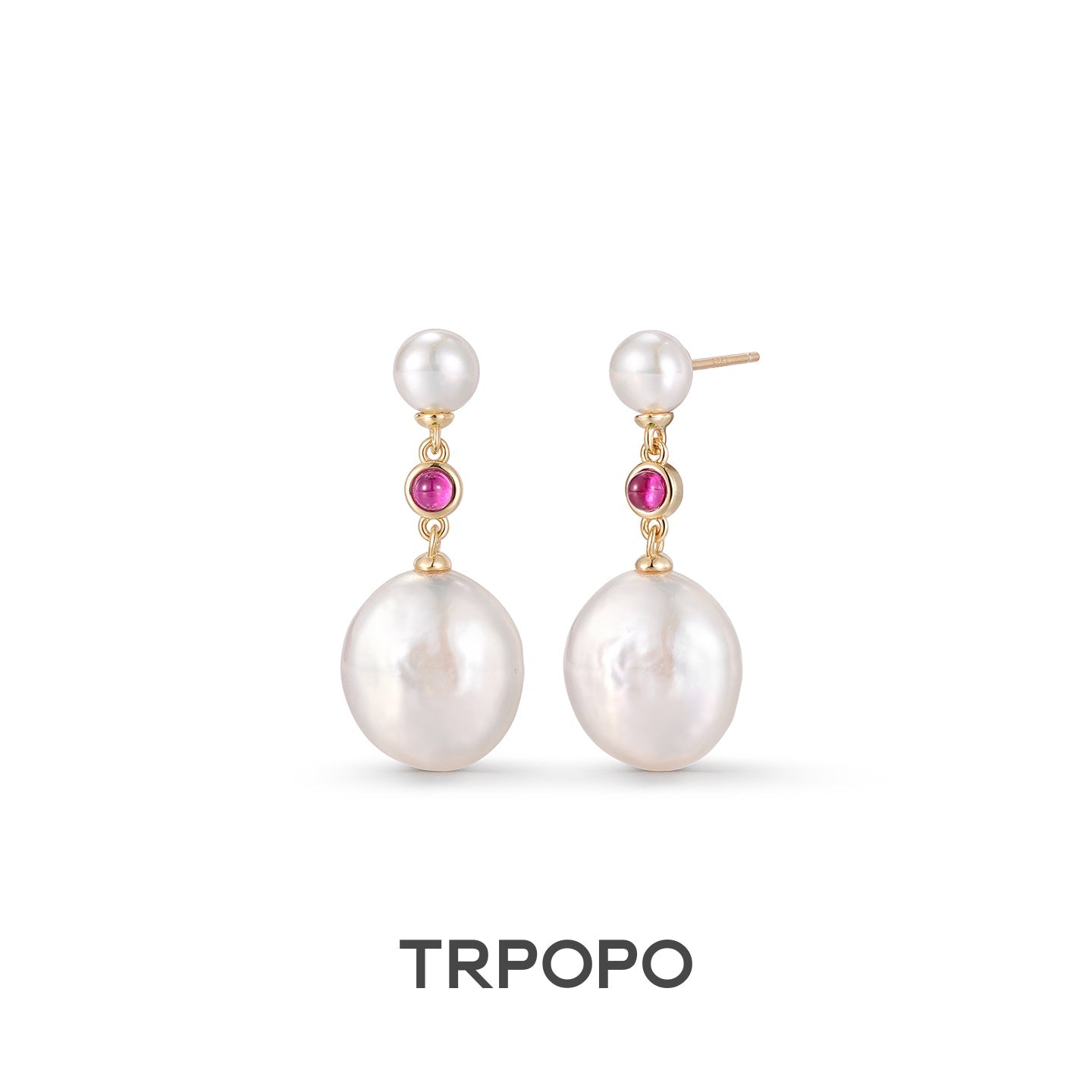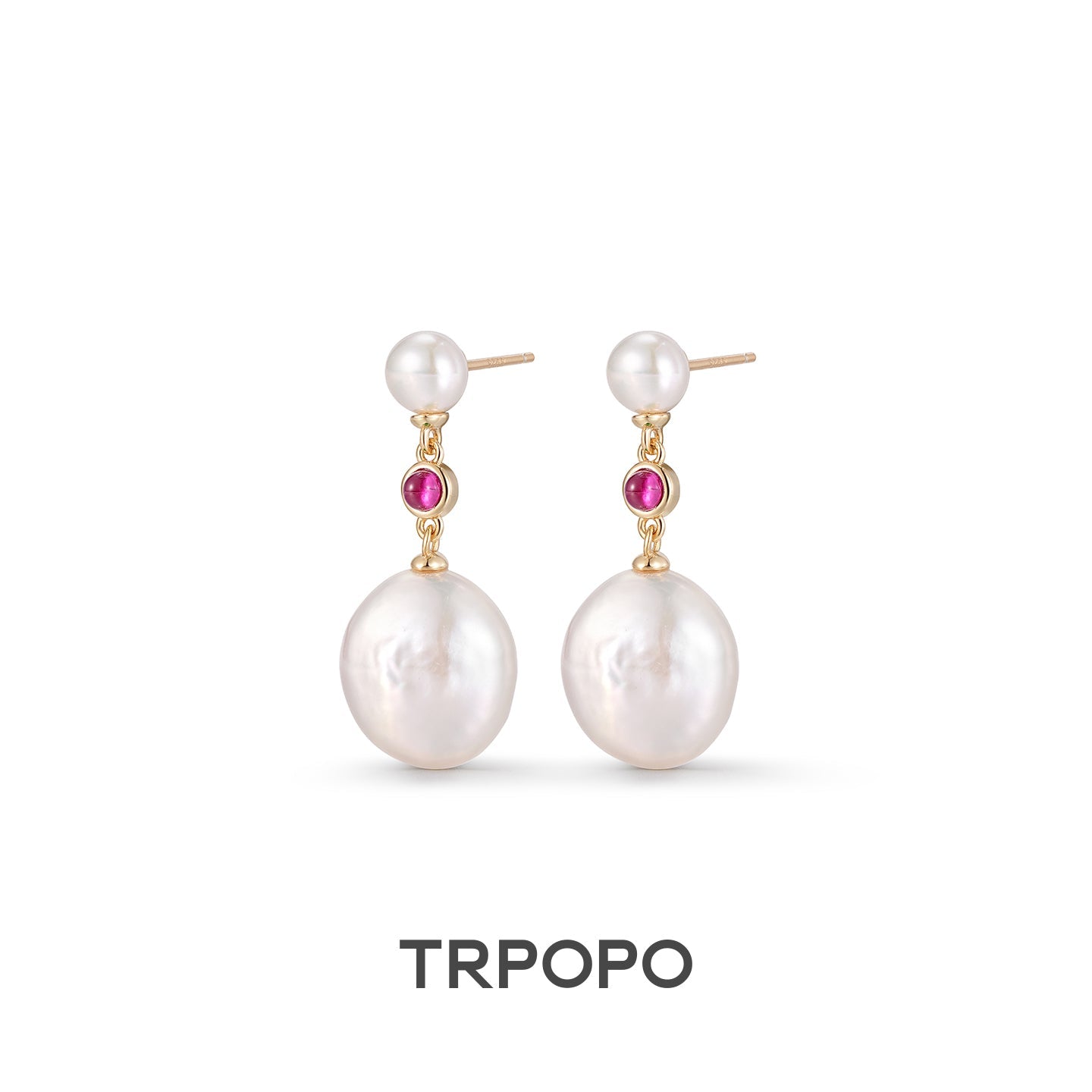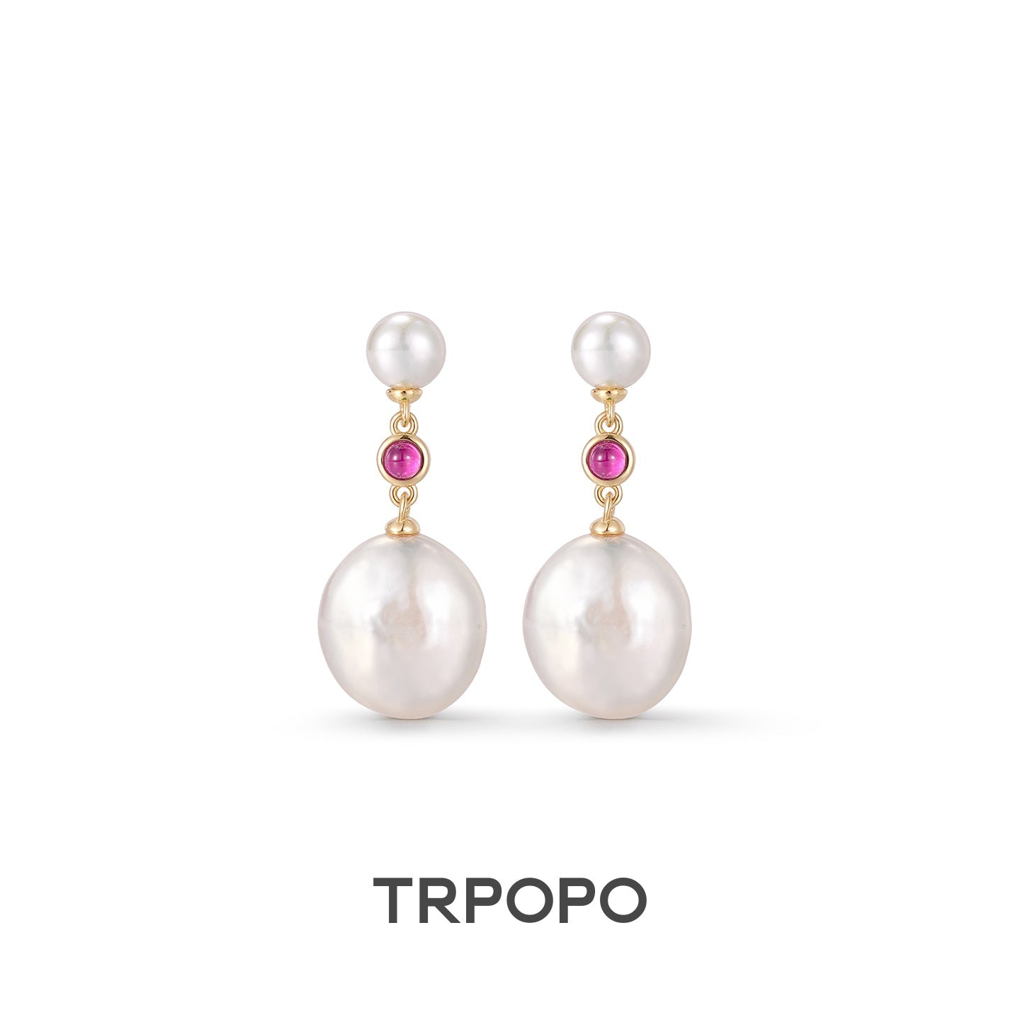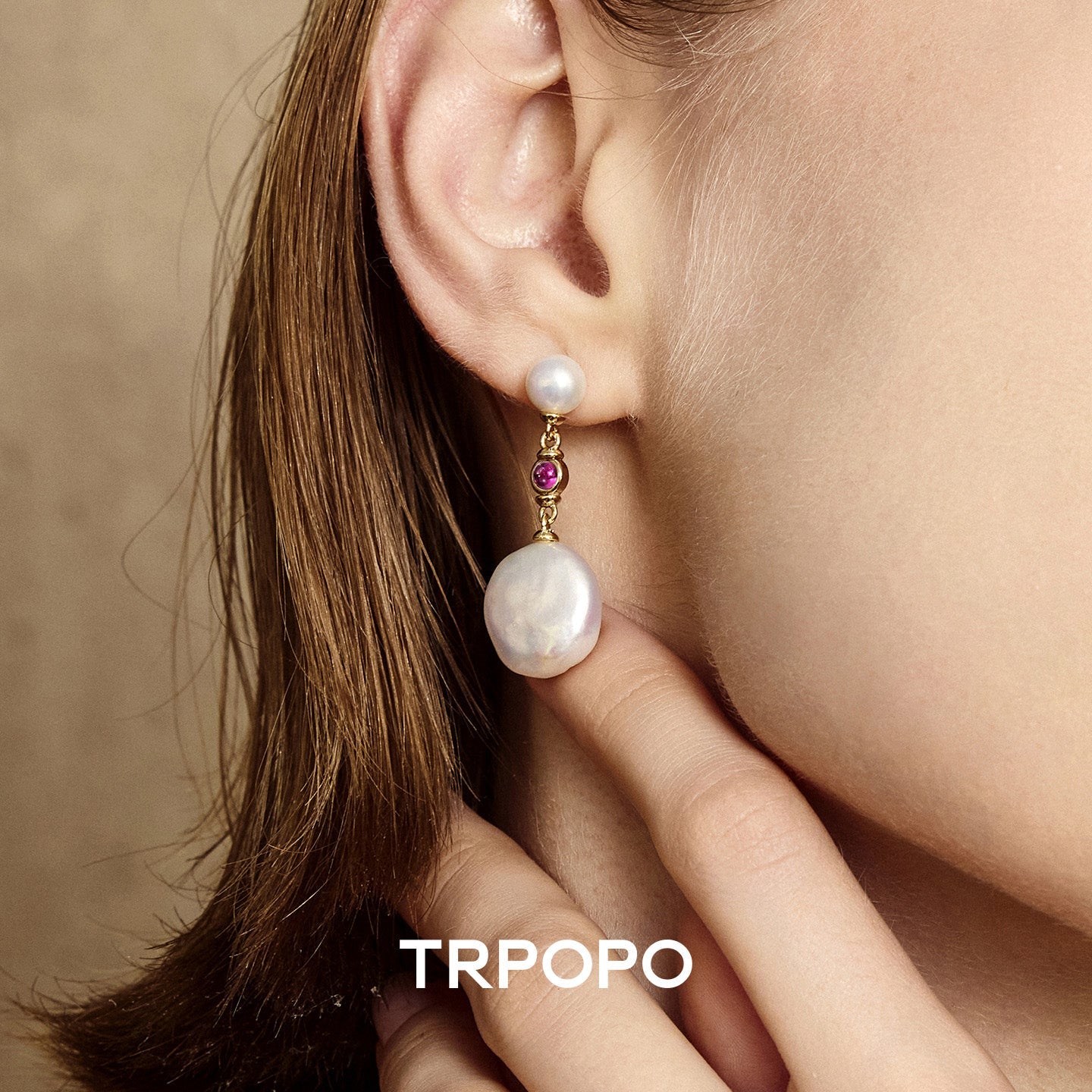 A small pearl atop, a lush baroque pearl below, kissed by a fiery ruby in between – soft white meets burning red, untamed luxury swaying at your ears.