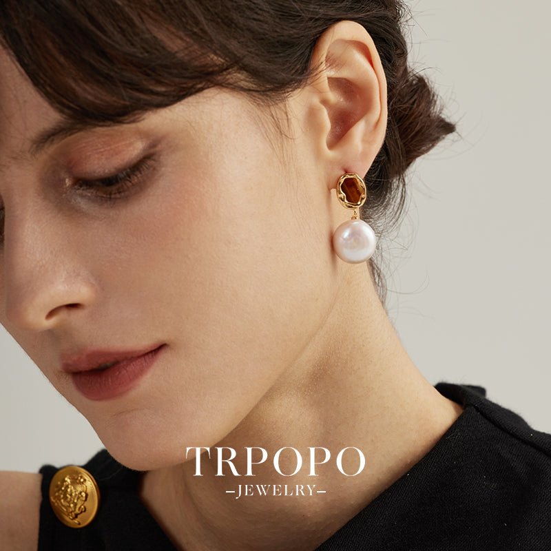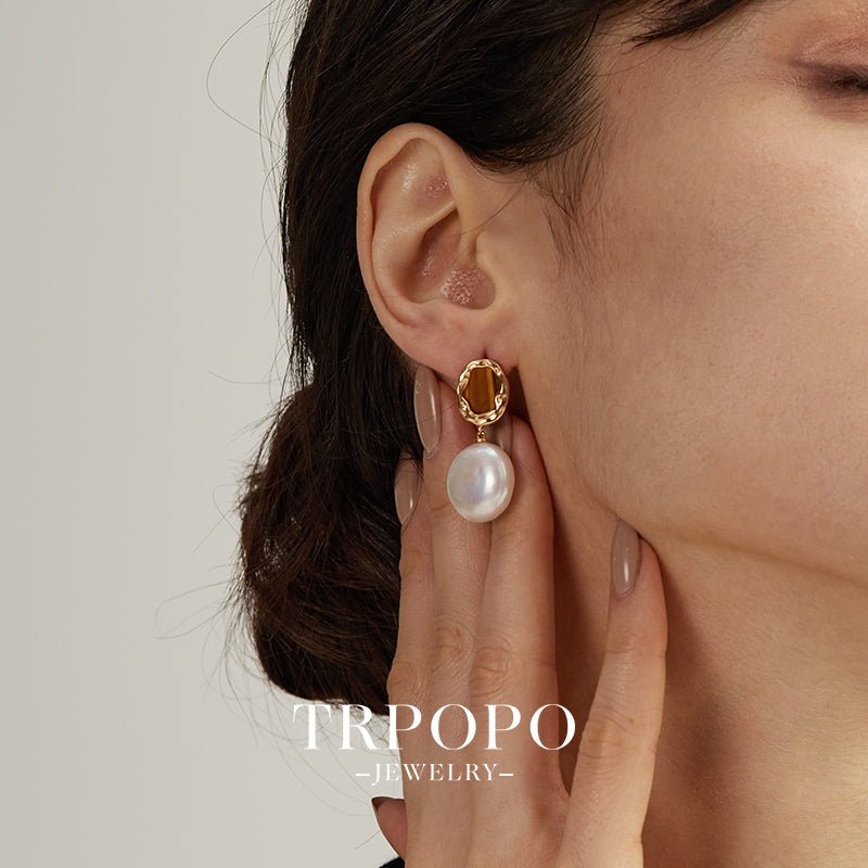 Baroque Pearl & Tiger's Eye Gold Earrings-Gold