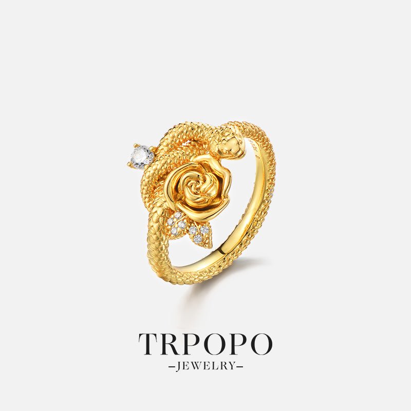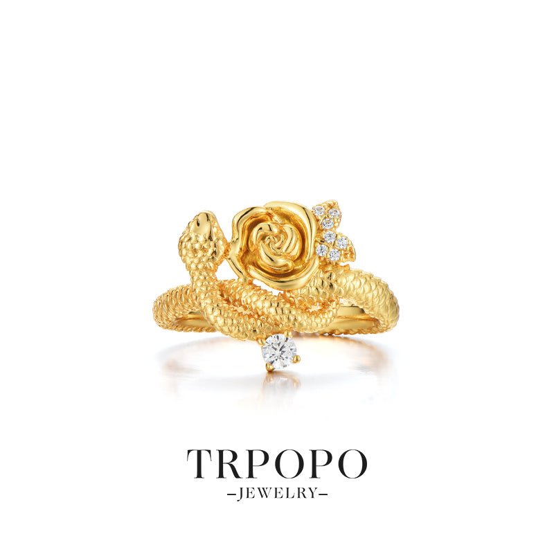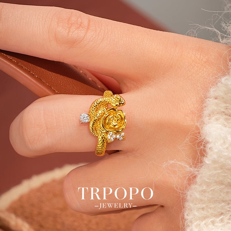 ring is crafted in gold, with the snake's body featuring delicate and lifelike textures as it twines. An exquisitely - made rose is nestled among it, with diamonds embellishing the leaves and other parts, shining brightly. It skillfully combines mystery and romance, showing a luxurious and unique style.