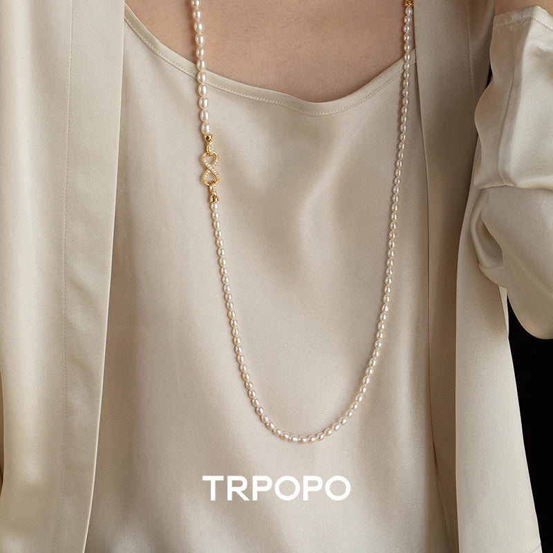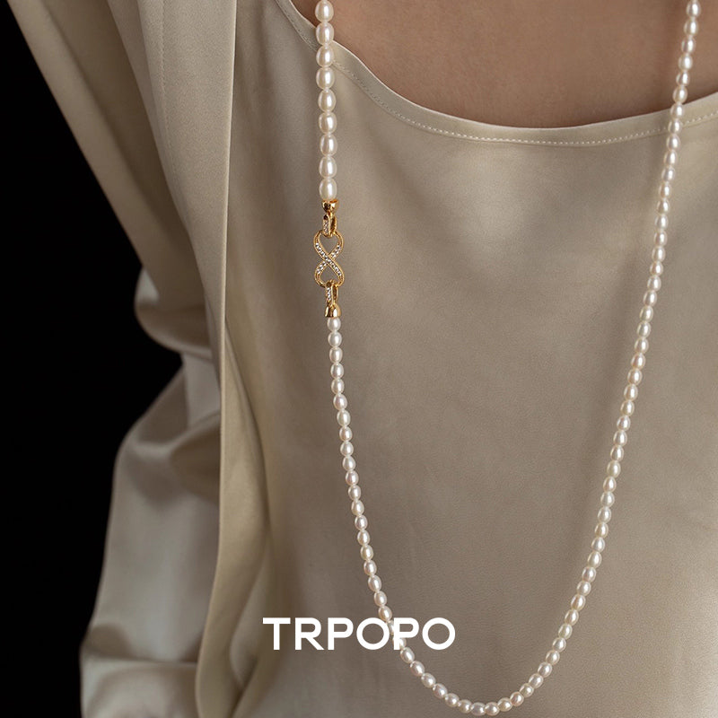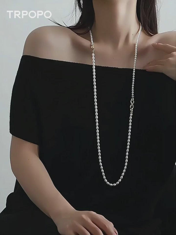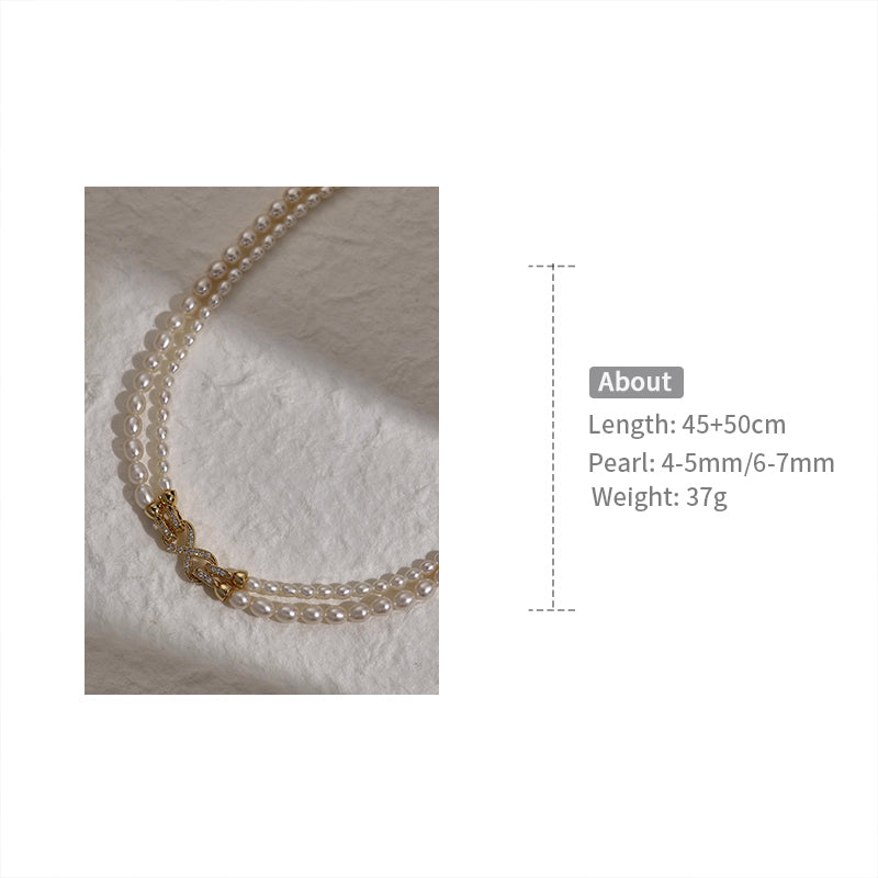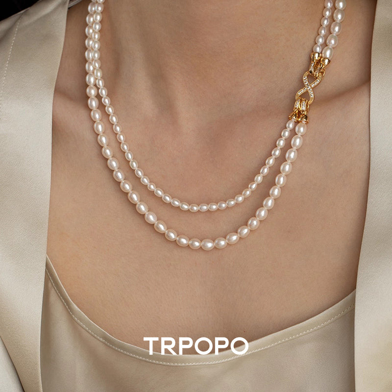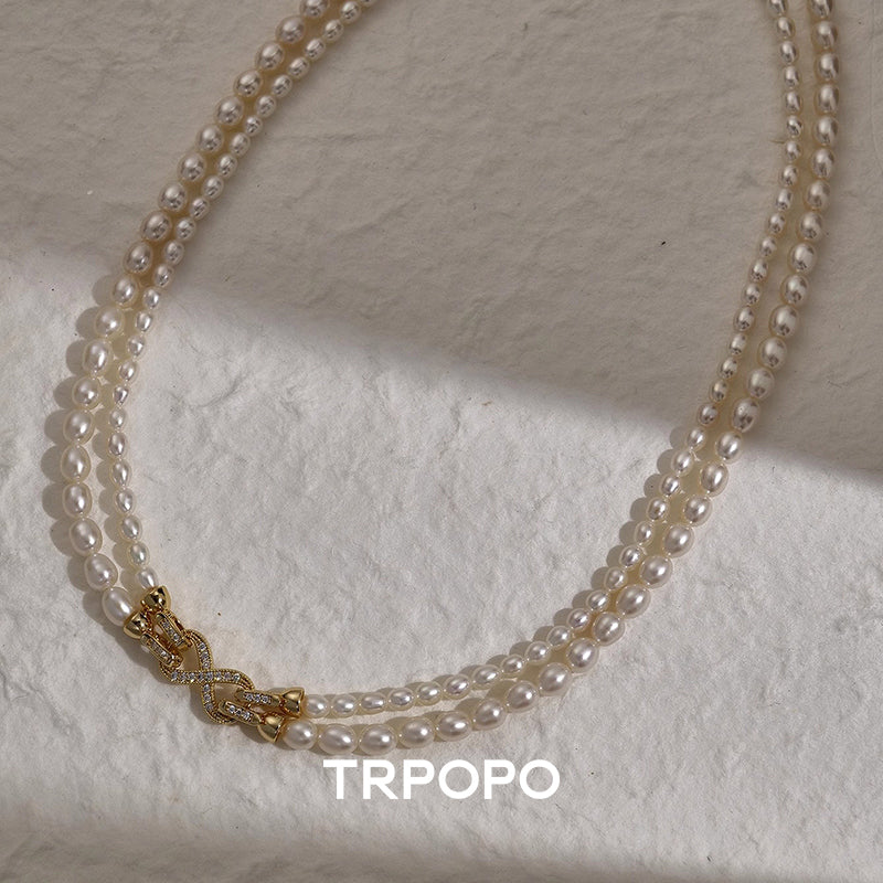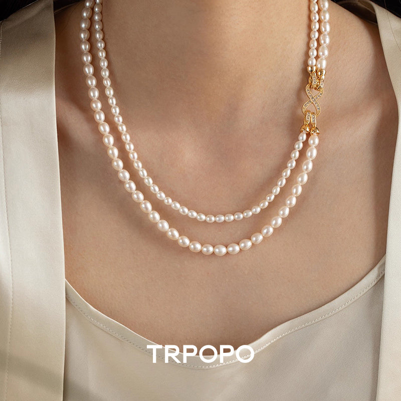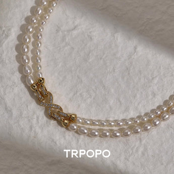 This necklace is composed of two strands of rice-shaped freshwater pearls with a gentle, soft luster. The centerpiece is the dazzling bow-shaped clasp adorned with micro-pave accents on the side, offering exquisite detail. The double-layered design is vintage and elegant, wearable as a choker or a short sweater chain to effortlessly achieve a refined, ladylike look.