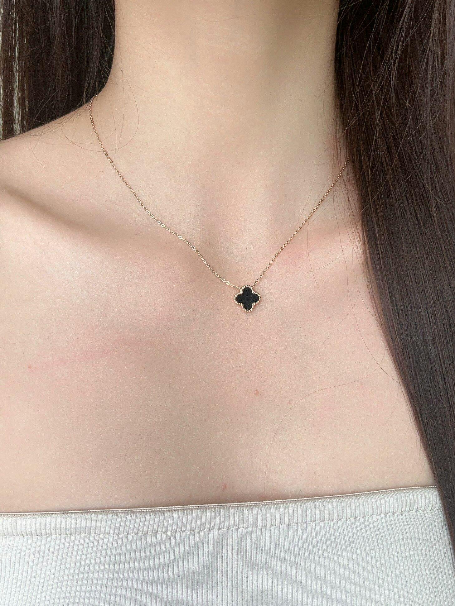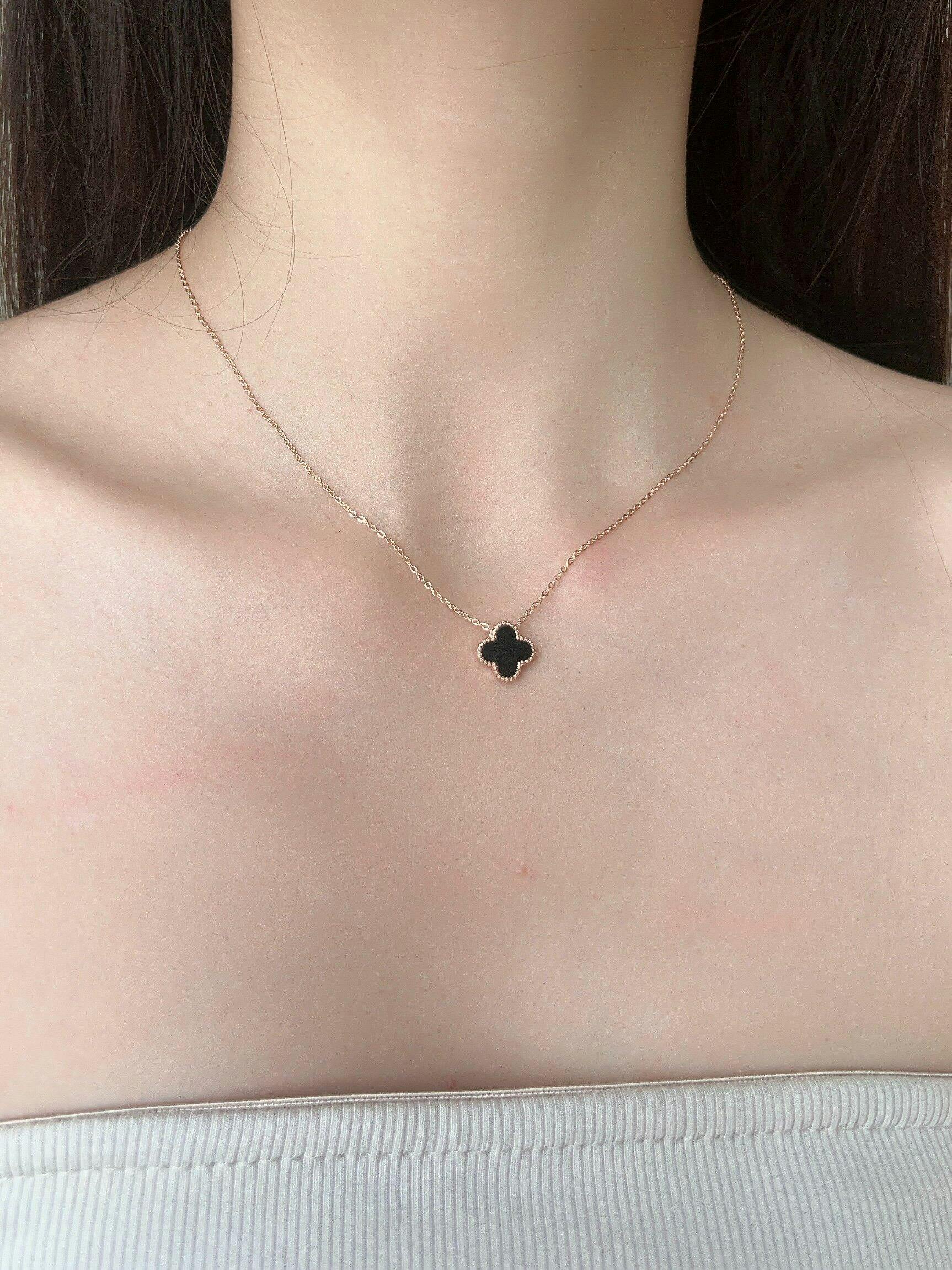 A reversible clover pendant: deep red agate/black onyx on one side, rose gold with diamond on the other โ€“ rose gold chain holds it lightly, switch between fiery passion and sparkle, double rebellion at your neck.