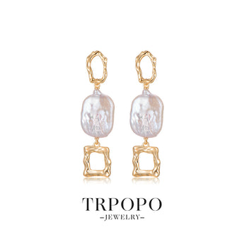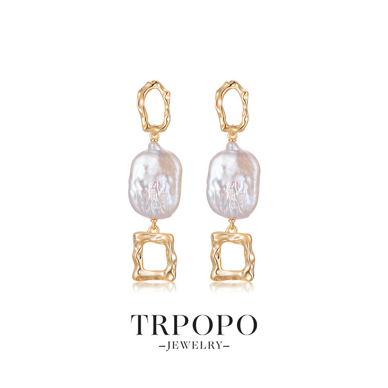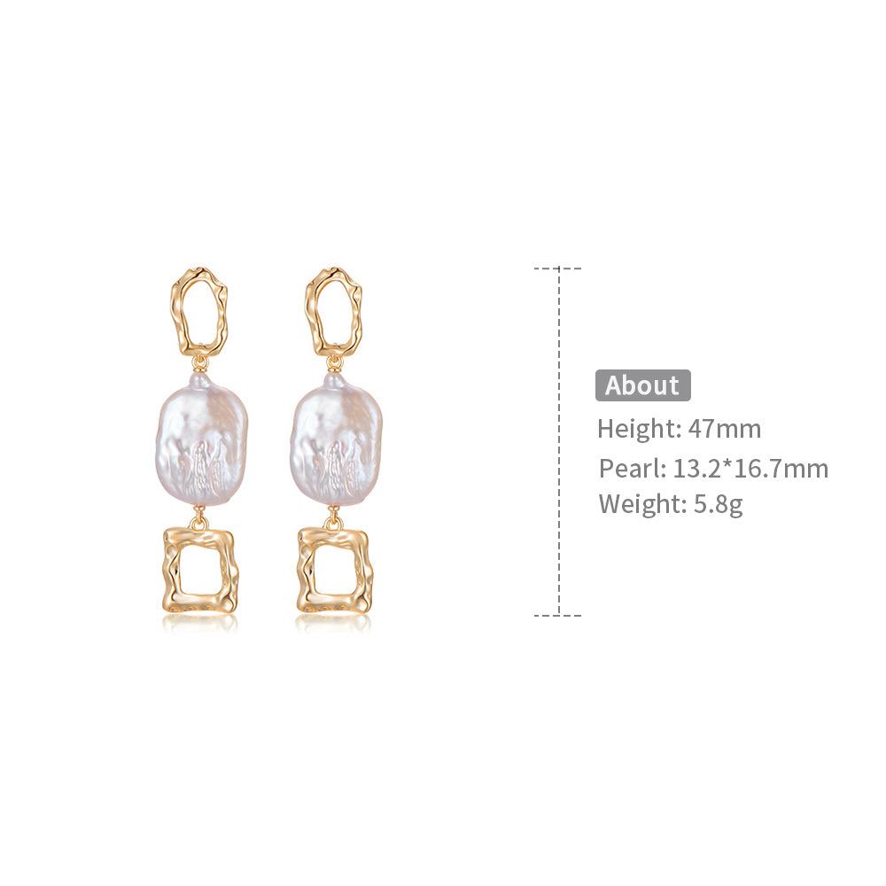 earrings showcase an exquisite design with irregular square gold - toned elements. They dangle gracefully, featuring large, lustrous baroque pearls in the center, creating a harmonious blend of classic and contemporary aesthetics.