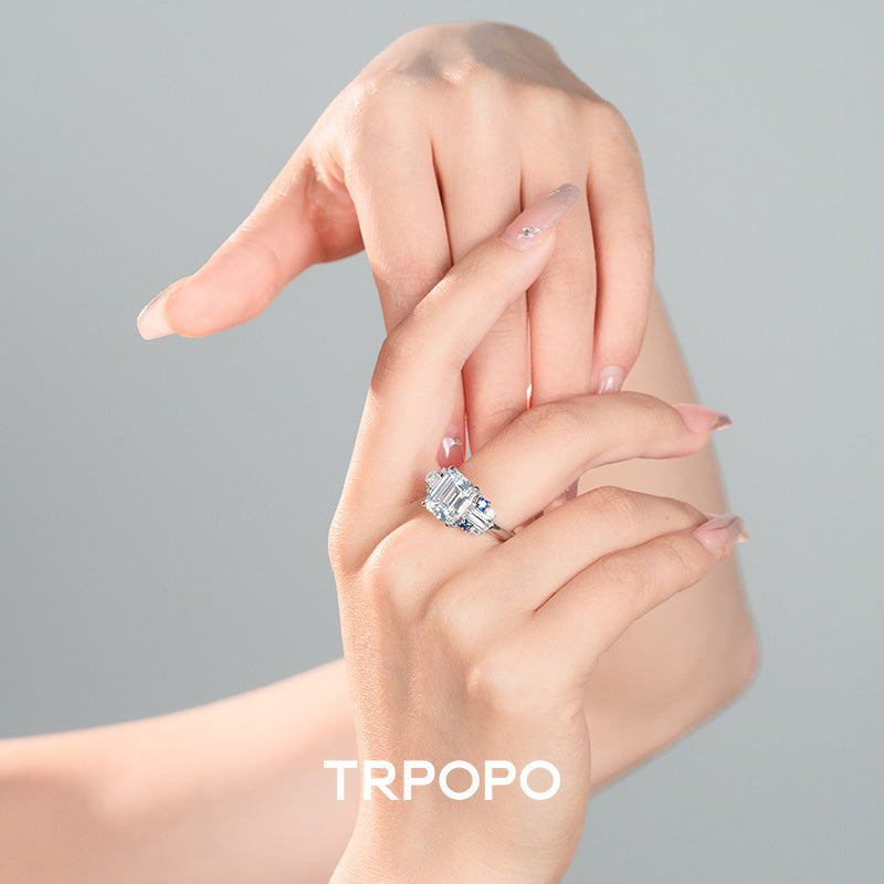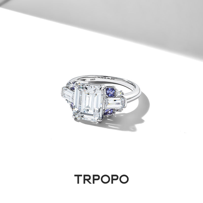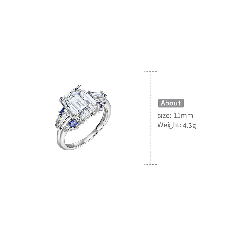Diamond-cut center diamond guarded by sapphire trapezoids, framed in layered brilliance – icy blue meets cold white, untamed power and mystery on your finger.