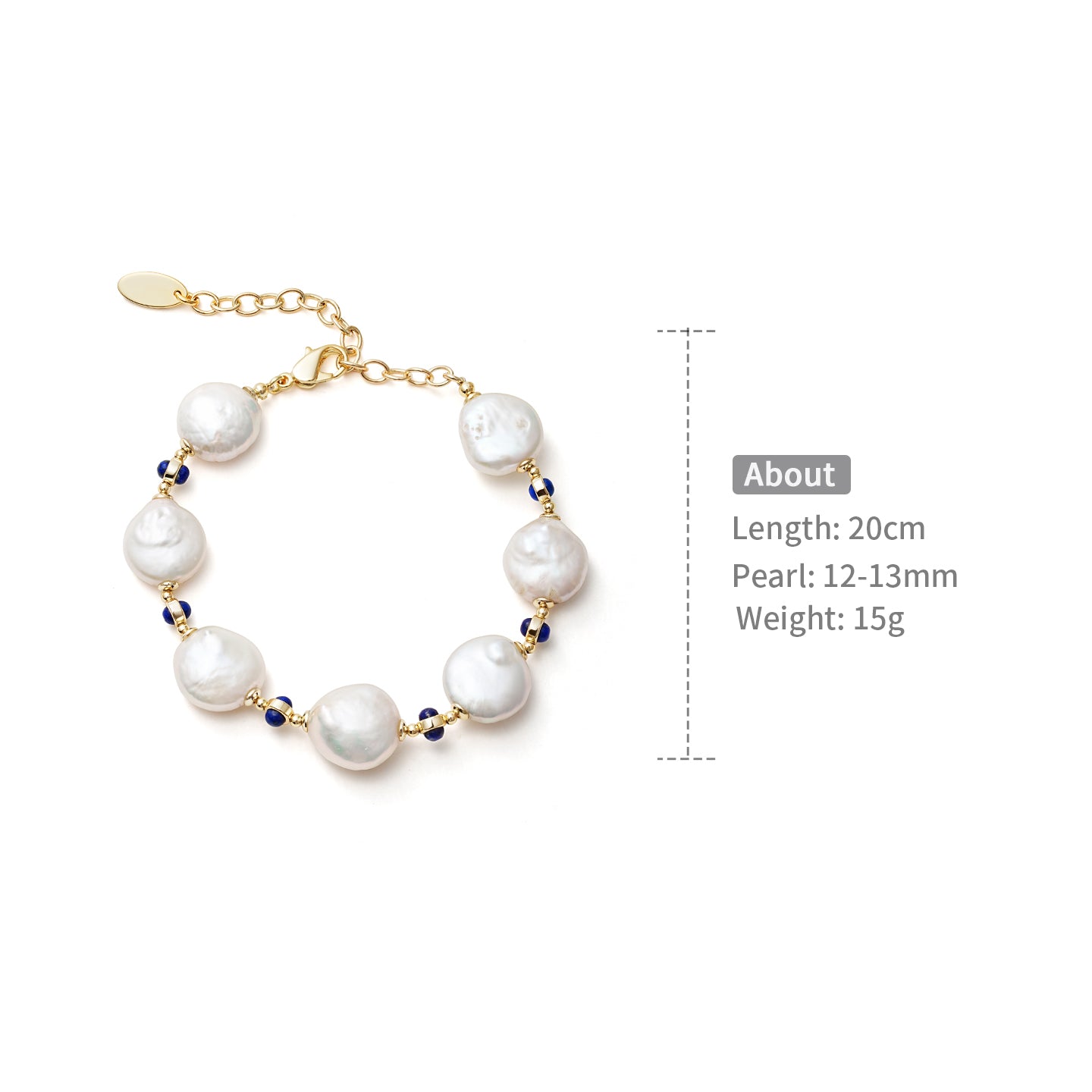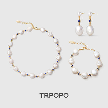 This set includes a necklace, earrings, and bracelet, all featuring lustrous large, flat Baroque pearls accented with deep blue Lapis Lazuli beads and gold spacers. The classic blue, white, and gold palette delivers a vintage and noble exotic appeal. Both the necklace and bracelet have adjustable extender chains, while the earrings are elegant drops. Wearing the full set makes a striking yet refined statement.