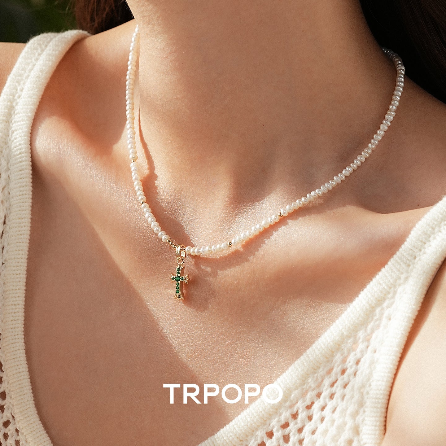 Delicate freshwater pearls form a soft glow, centered by an emerald cross pendant โ€“ faith meets untamed spirit, resting gently at your neck to radiate your unapologetic brilliance.