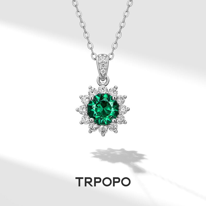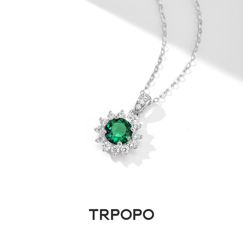 A fierce emerald crowned by radiant diamond petals, blooming like a sunflower โ€“ wild green fire ignites at your neck, dazzling and untamed.