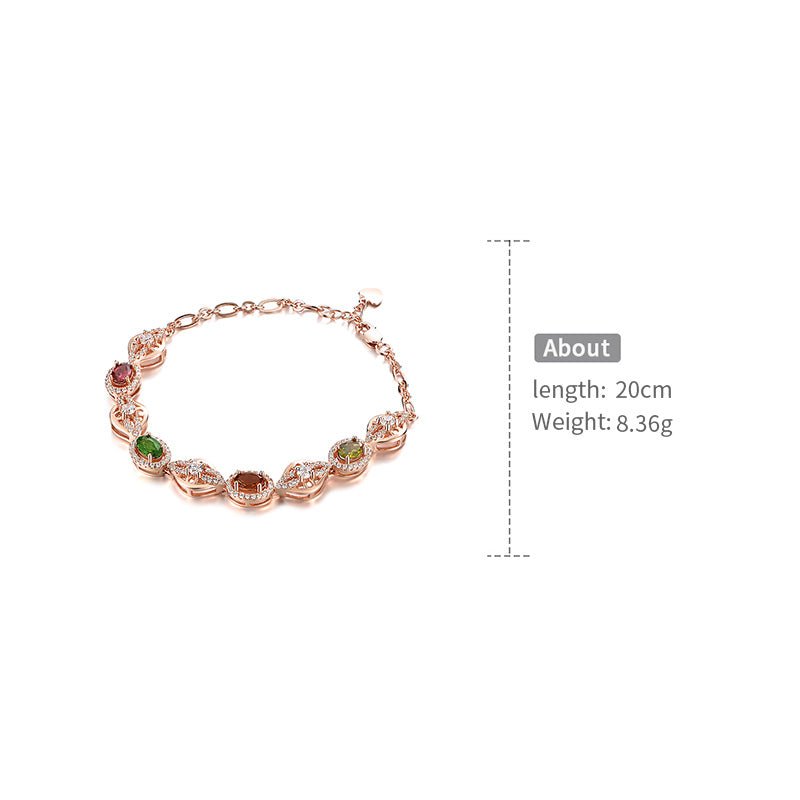 Rose gold chain links vibrant colored gems and diamond halos, pink, green, orange weaving a rainbow โ€“ each stone a burst of untamed emotion, gentle yet boldly radiant at your wrist.