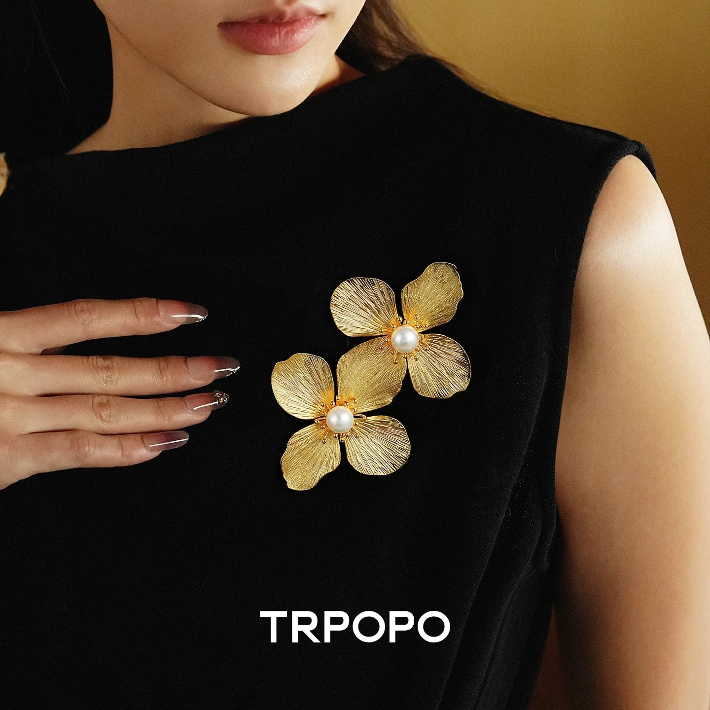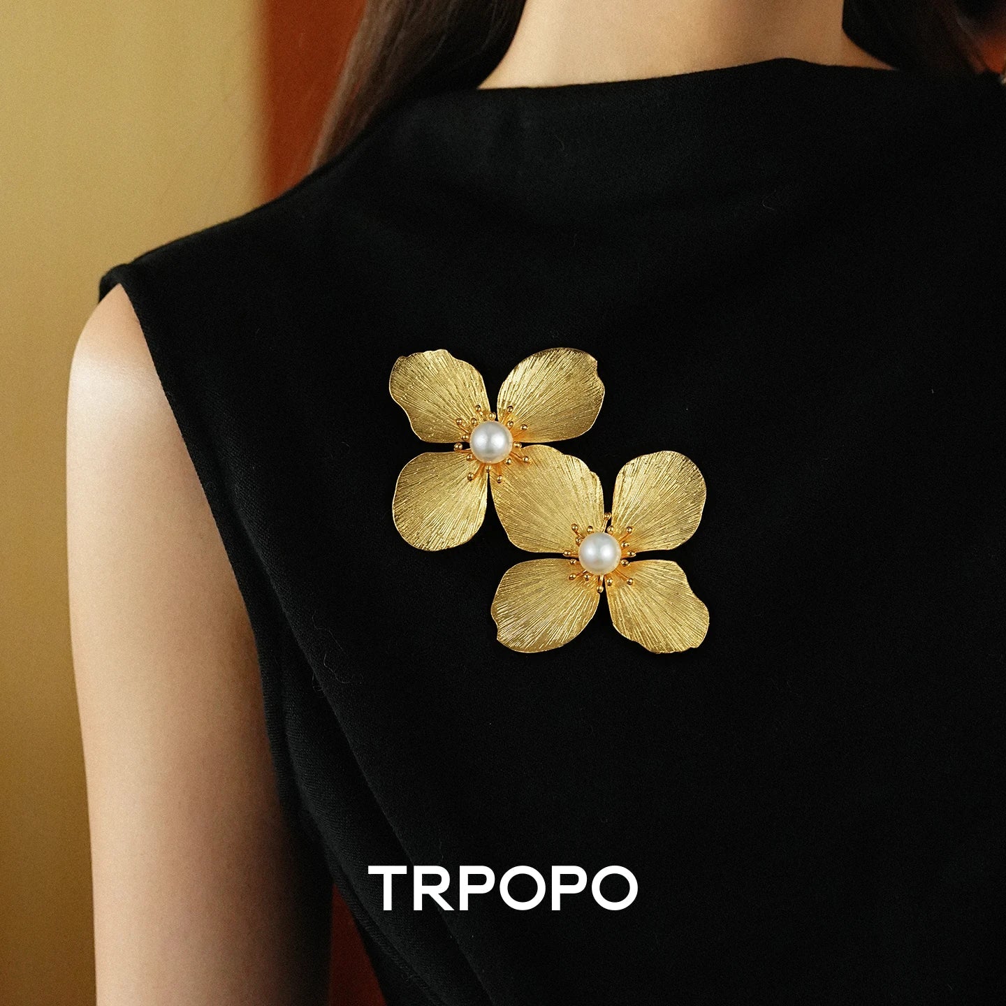 Delicate golden flower with hand-textured petals and a lustrous freshwater pearl center. Vintage-inspired yet effortlessly elegant โ€” perfect for pinning on collars, scarves, or bags to add a romantic, sophisticated touch to any look.